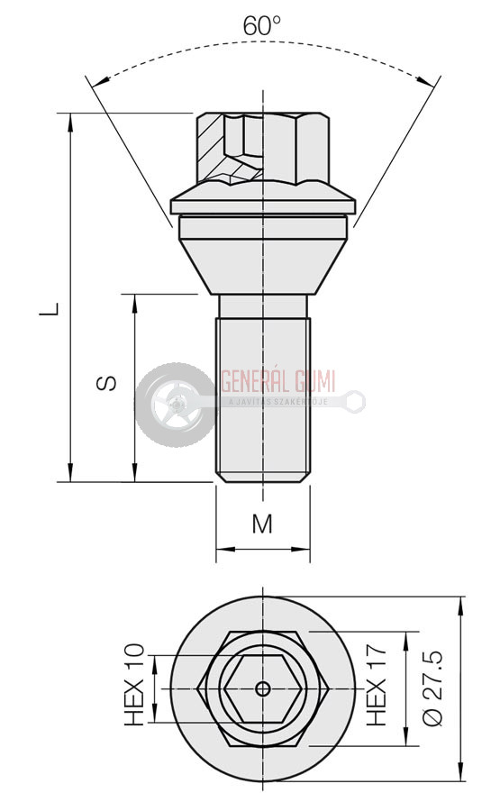 14x1,25x28WB HEX17 kerékcsavar, forgó kúpos 60°, FEKETE, ELB1360